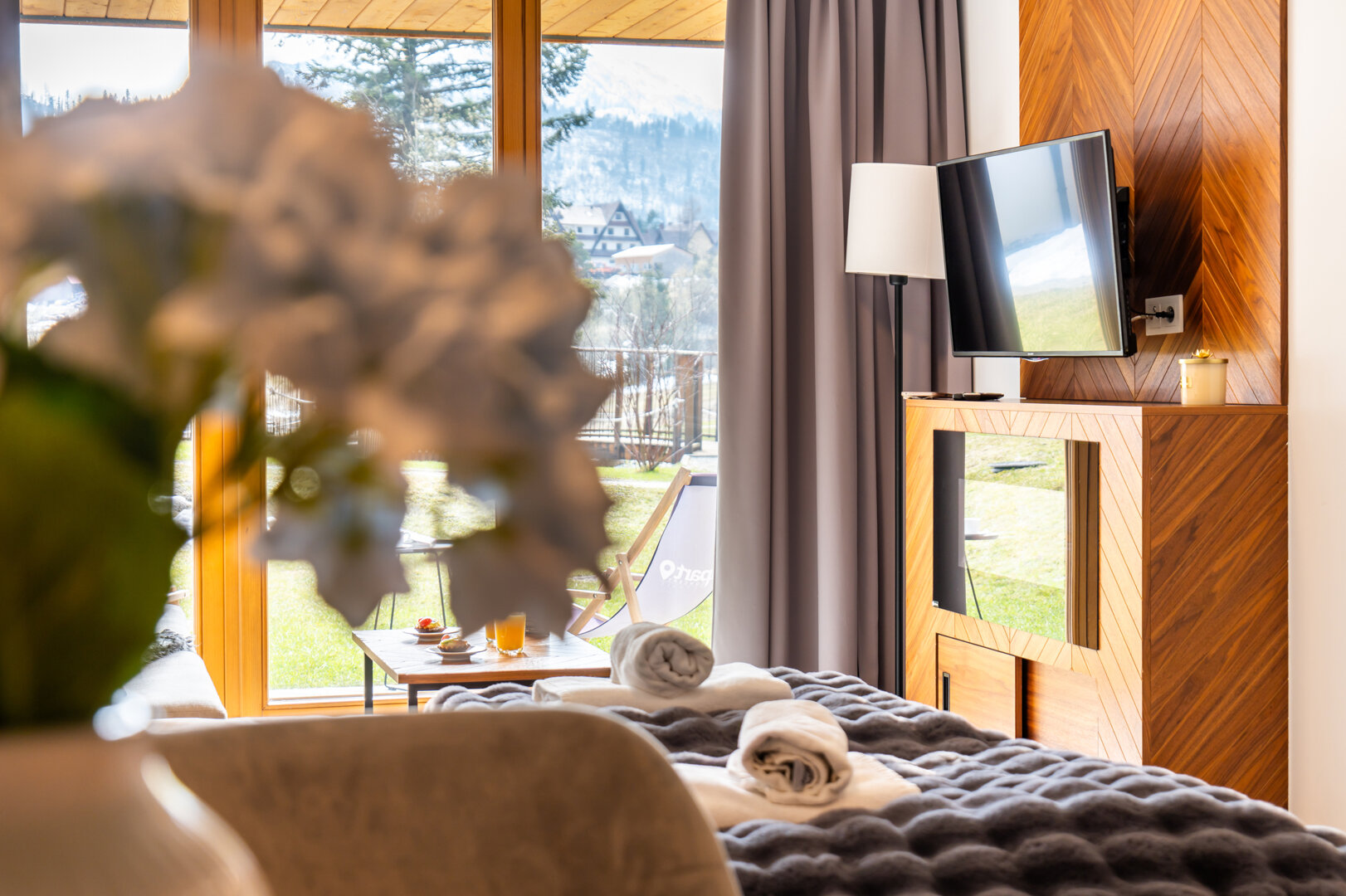 Wyjątkowym atutem apartamentu jest widok na Tatry – naturalna sceneria, która nadaje każdemu pobytowi niepowtarzalny klimat i pozwala w pełni poczuć magię gór.