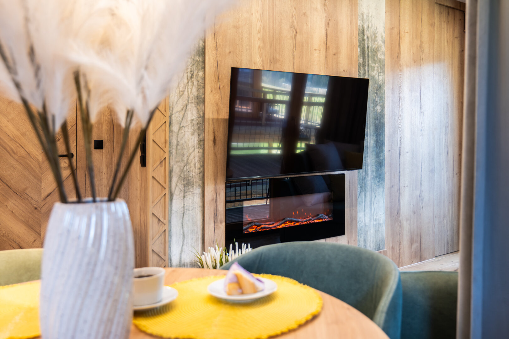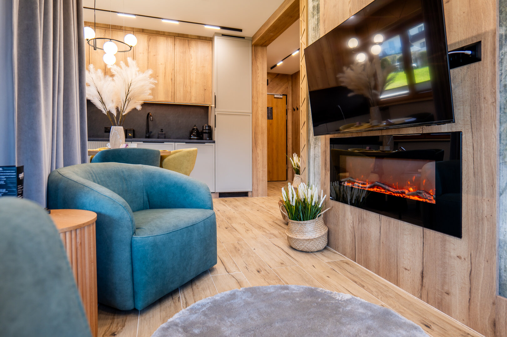 Apartament oferuje dwie stylowe sypialnie, przestronny salon z eleganckim aneksem kuchennym oraz nowoczesną łazienkę, zaprojektowaną z dbałością o każdy detal. Sercem wnętrza jest kominek, który nadaje przestrzeni wyjątkowego, przytulnego charakteru i tworzy idealną atmosferę do relaksu po dniu spędzonym w górach.