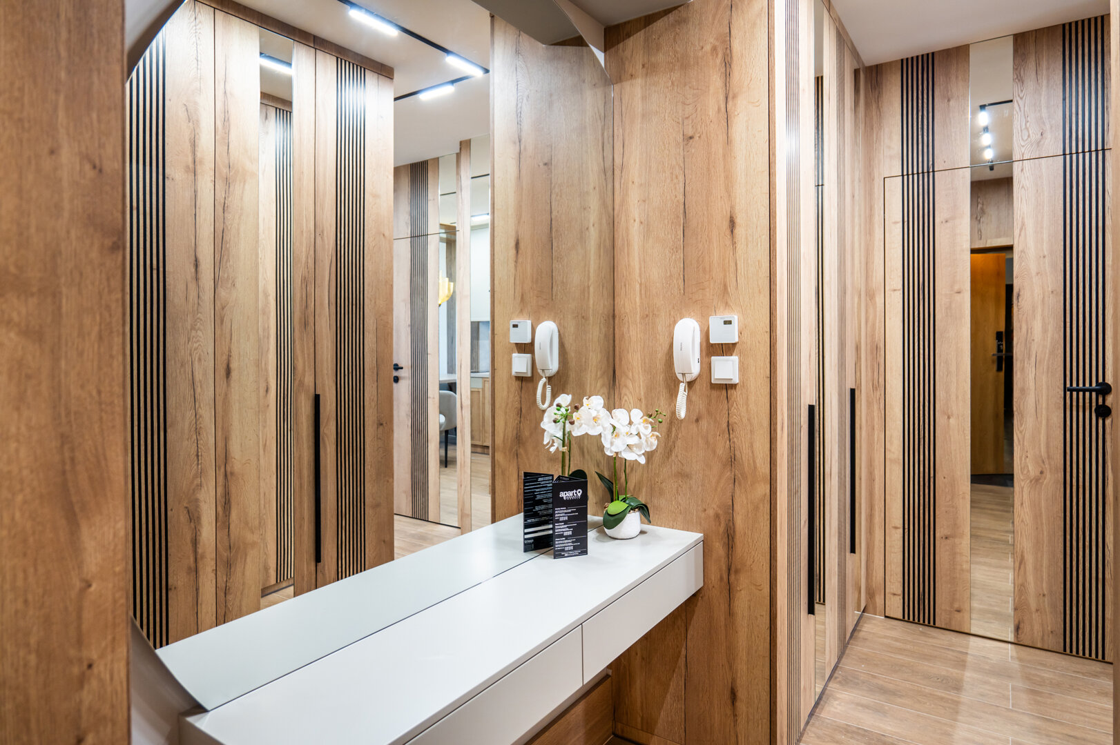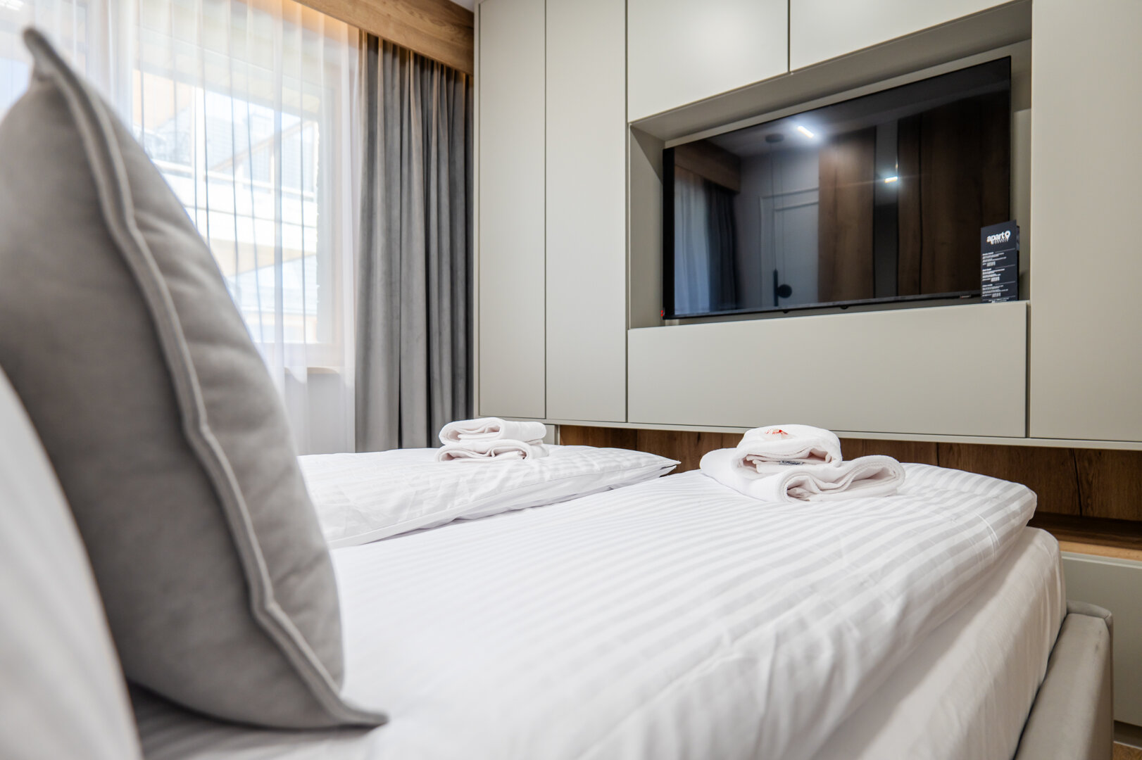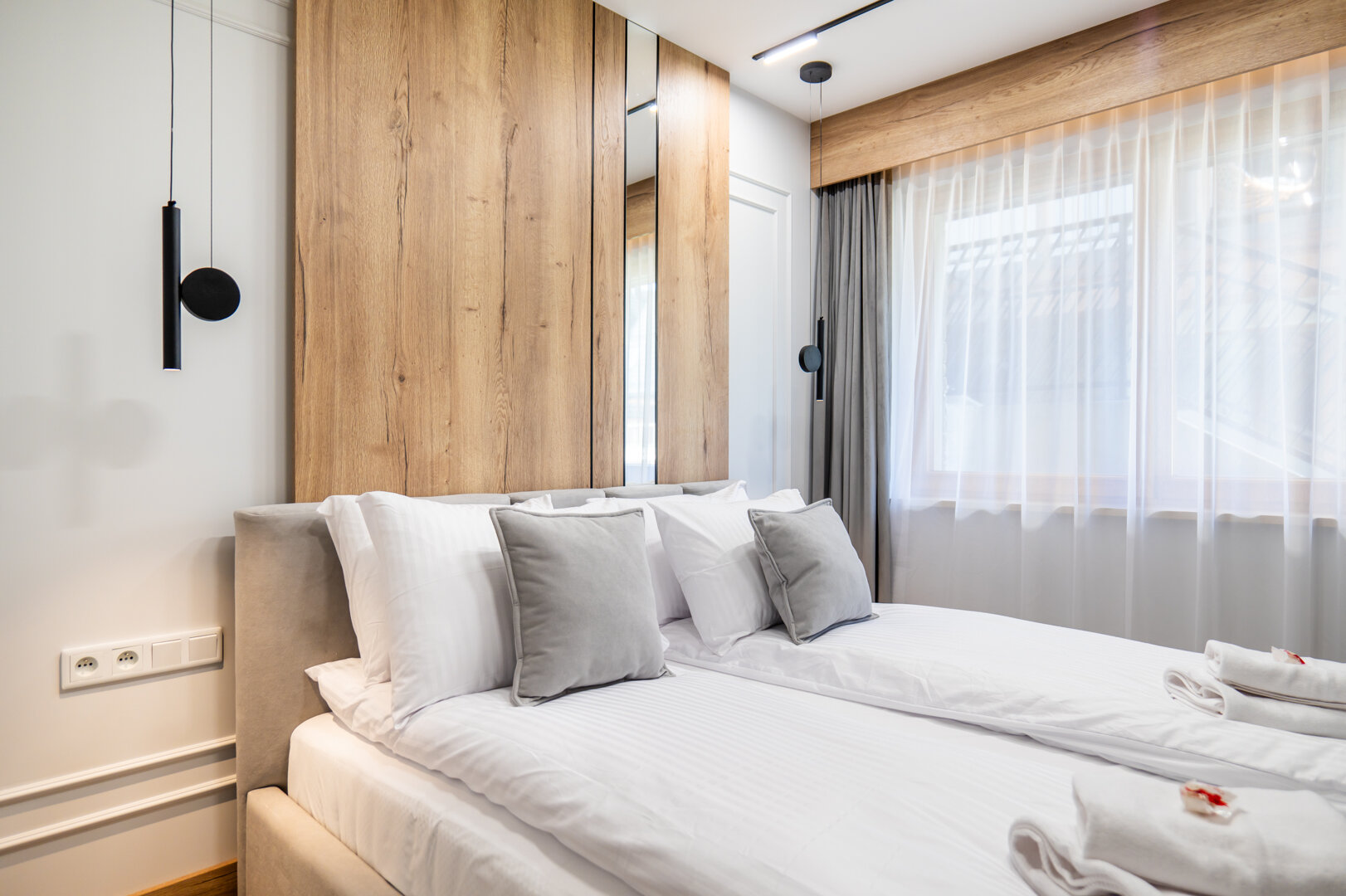 Apartament przeznaczony jest dla 6 osób i oferuje dwie eleganckie sypialnie, przestronny salon z rozkładaną sofą oraz w pełni wyposażony aneks kuchenny, idealny do wspólnego spędzania czasu. Do dyspozycji gości jest stylowa łazienka oraz dodatkowa toaleta, co zapewnia pełną wygodę nawet przy większej liczbie osób.