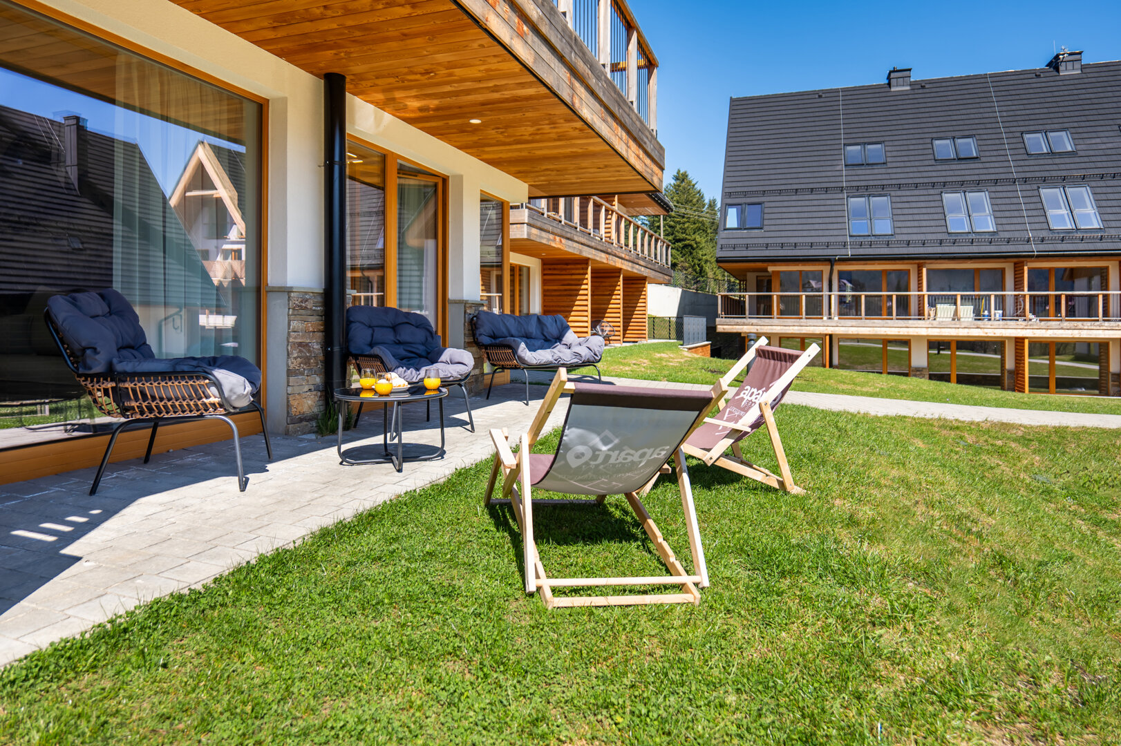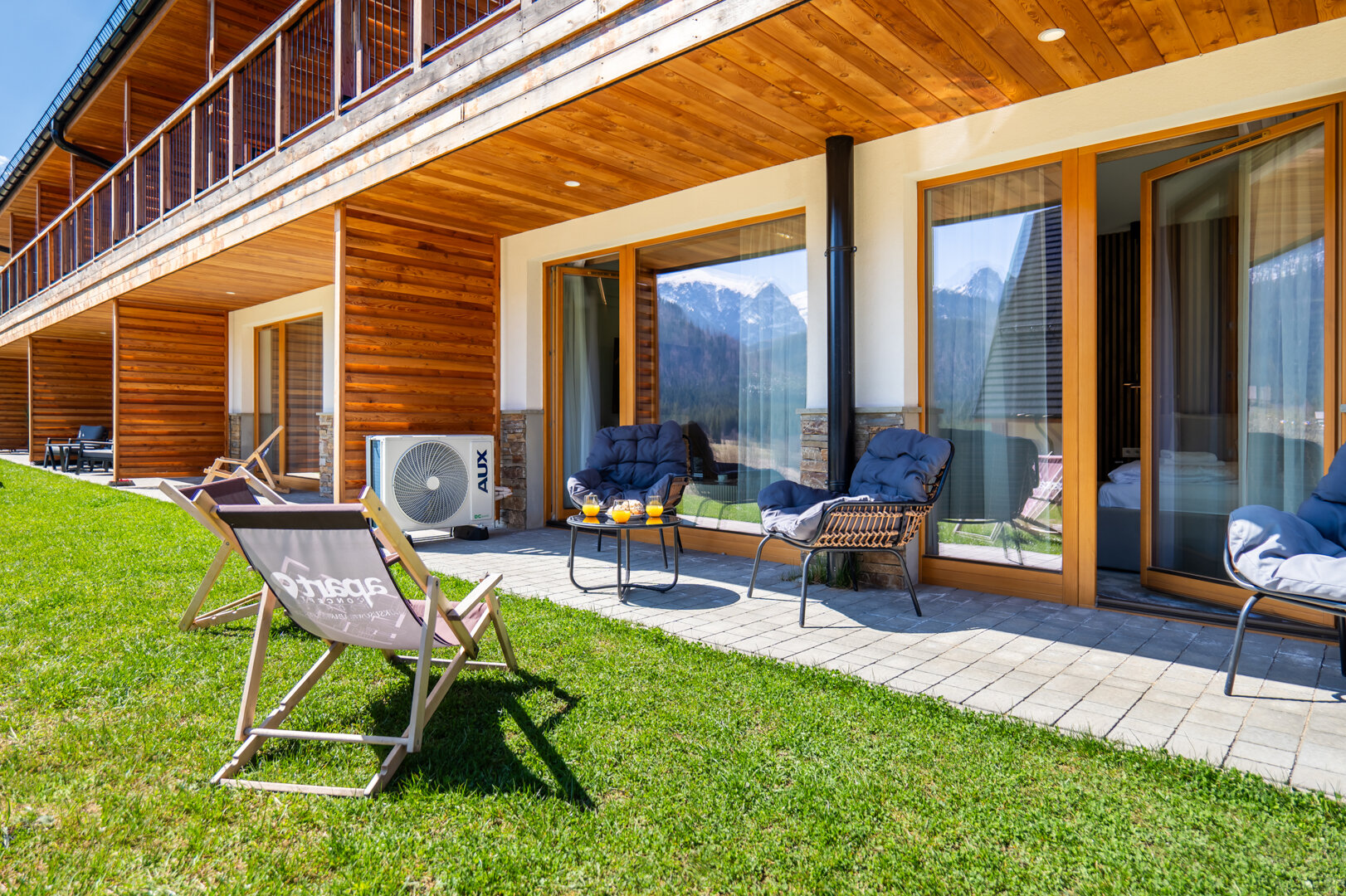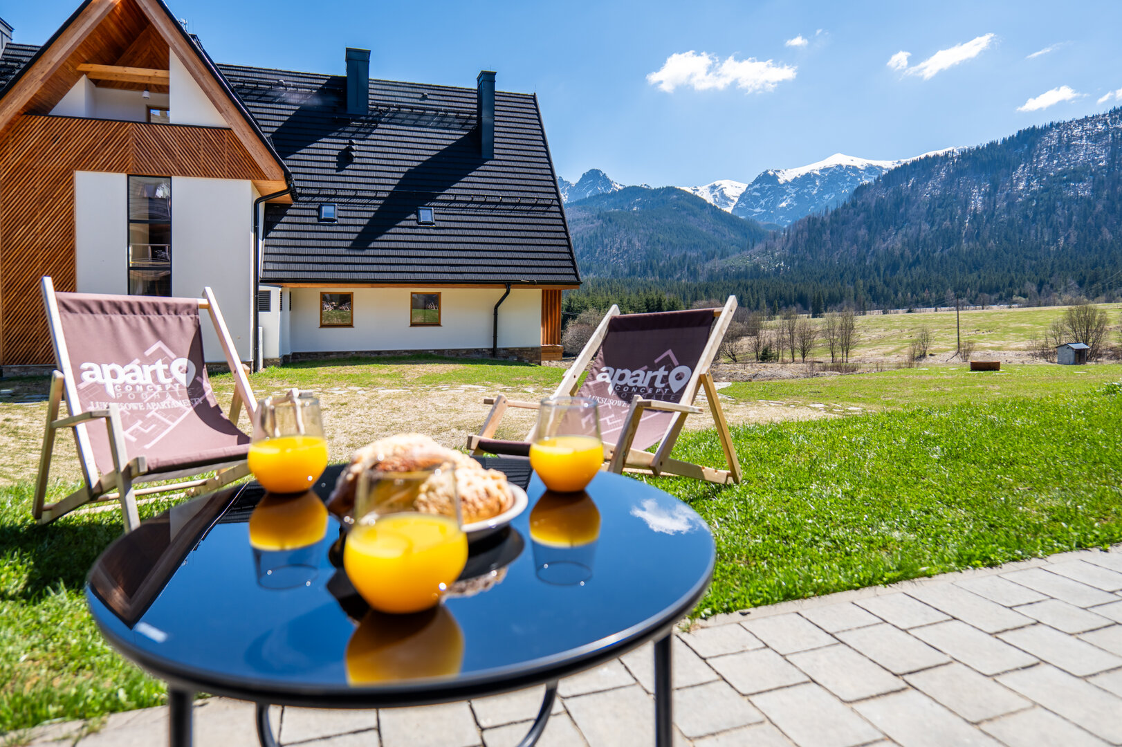 Wyjątkowym atutem apartamentu jest prywatny taras / patio, który pozwala w pełni cieszyć się górskim klimatem. To idealne miejsce na poranną kawę z widokiem na Tatry, chwilę relaksu w ciągu dnia czy spokojny wieczór przy zachodzie słońca.