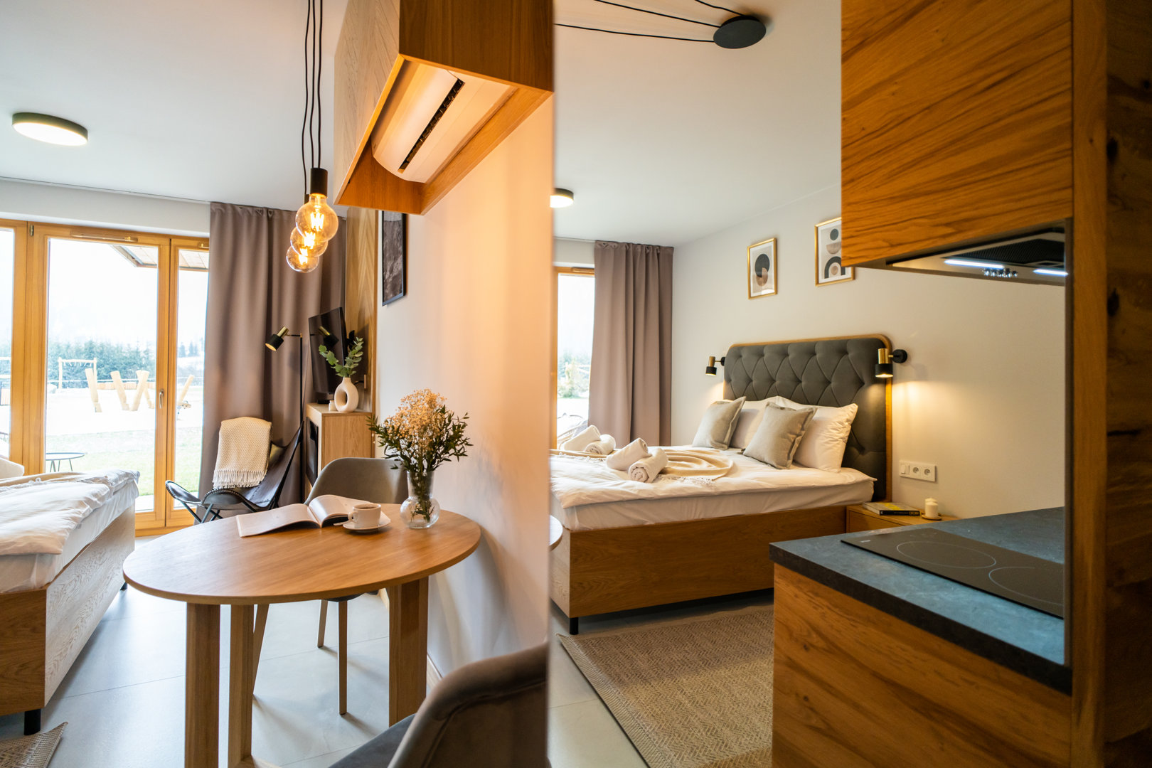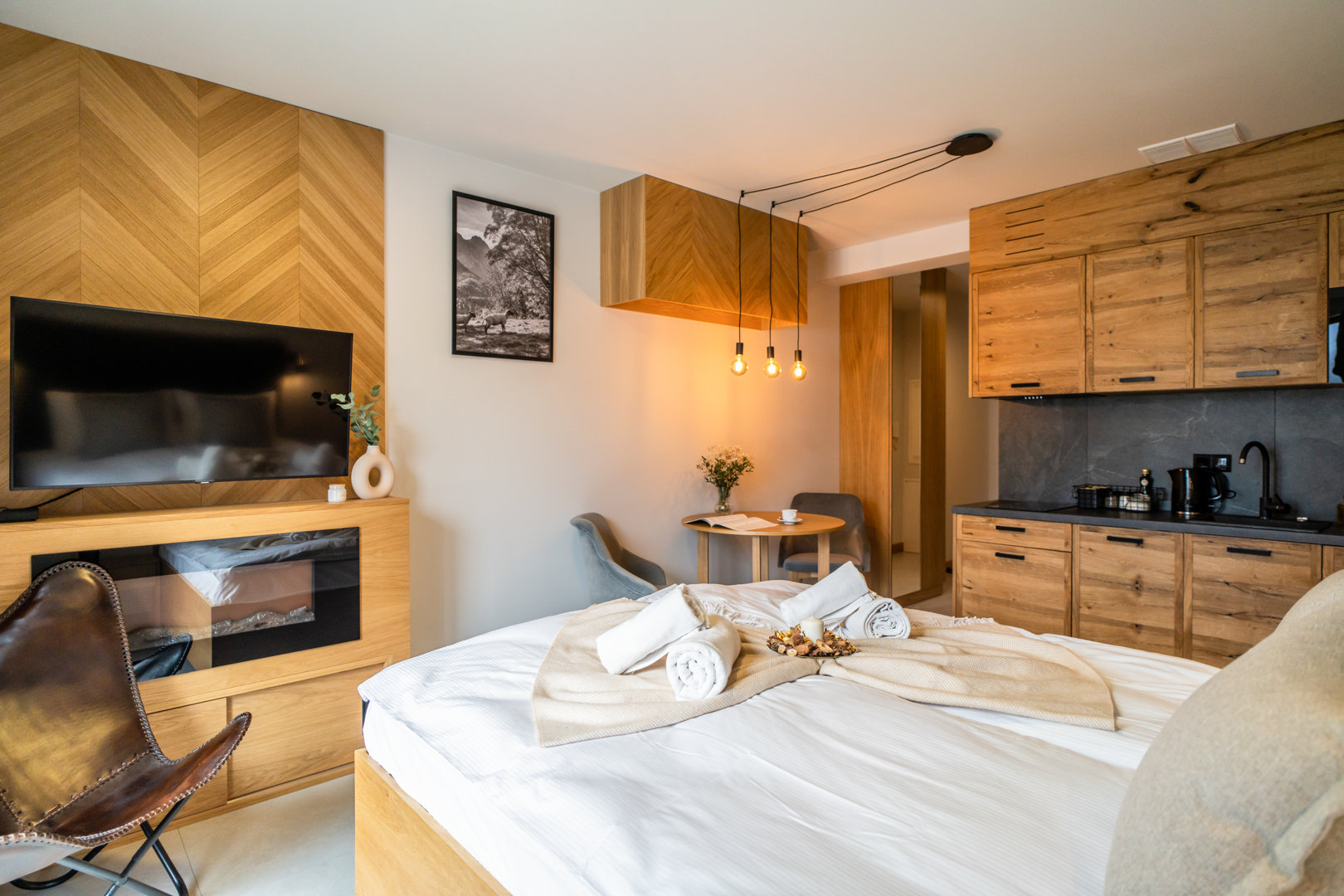 The Great Turnia Apartment is a magical place ideal for one or two people. The modern and stylish interiors, which combine loft style with regional elements of the Podhale region, allow for a holiday full of comfort. In addition, the proximity of the mountains and wonderful walking trails is a great opportunity to take in the mountain air. The flat offers a spacious bedroom with a large bed, a fully equipped kitchenette, a bathroom, a separate dining area and a patio equipped with garden furniture. In addition, the flat includes free parking and WiFi access.